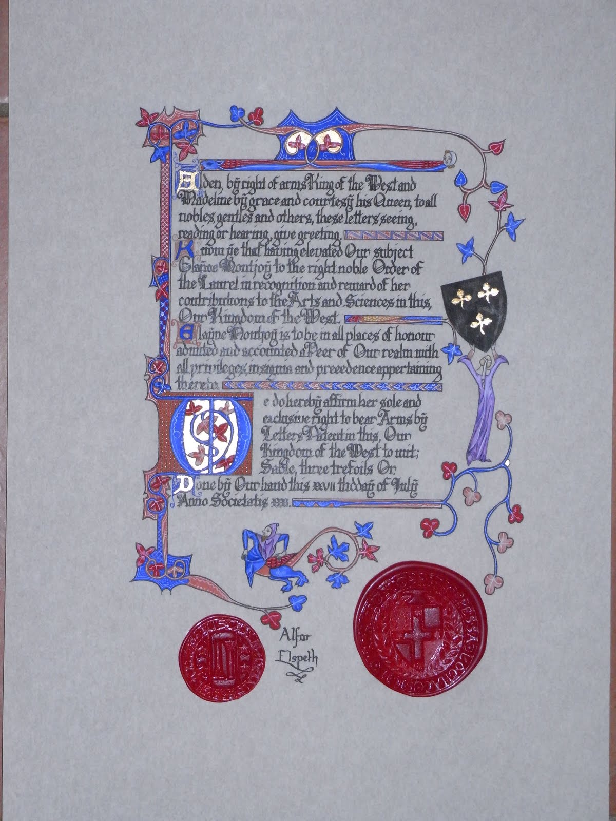 There are a few things that I think it would be a good idea to comment on, first I would prefer it if peerage scrolls are shown in stages but a final photograph of the completed scroll not put up until the recipient has seen the scroll. I have less concerns about AoA’s so but am open to comments about this.