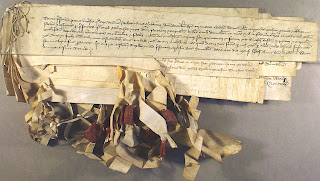 I don’t think that third charter has extra cuts on the fold of the turn up, I think what we are seeing is tags both layers of the looped tag beneath the document that has created an imprint on the top layers- period vellum is rather than the heavy archival papers we use. It looks odd because we’re more used to that loop coming at the back, although this is the style used today (with wide grosgrain ribbons) in mundane grants of arms.